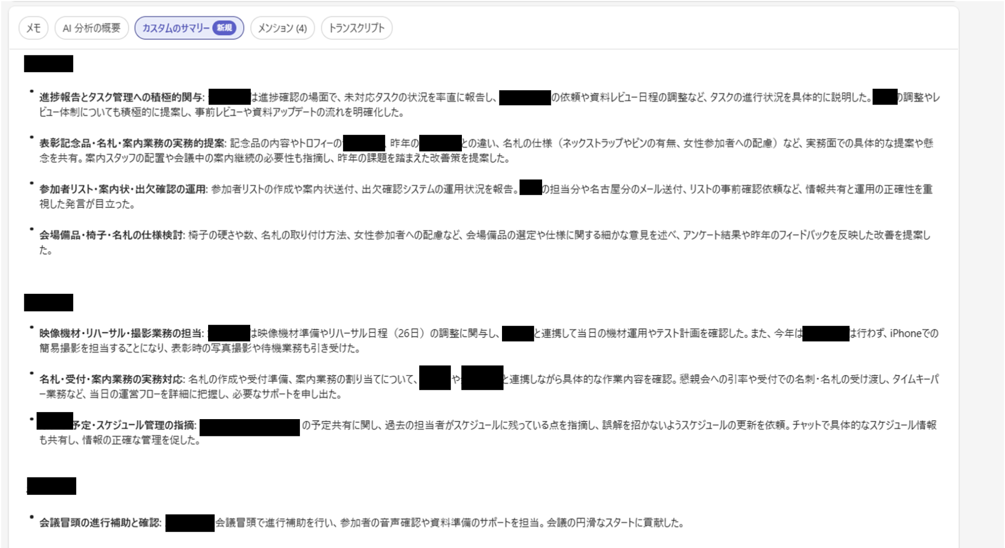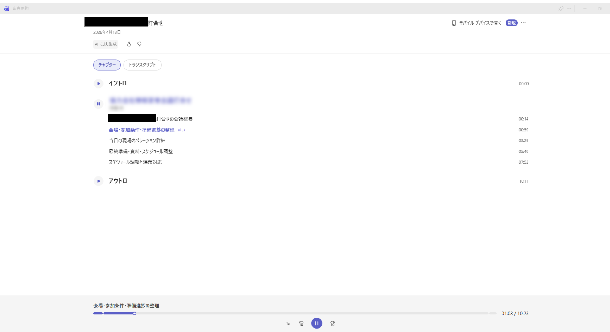 文字を読むよりも音声のほうが理解しやすい方や、作業中で画面を確認できない場合、電車などの移動中に音声で会議内容を把握したい場合など、さまざまなシーンで活用できそうな機能だと思います。なお、実際にどのように音声要約されるかについてですが、動画での公開は画像のようにマスク処理が難しいため、本資料では一部を文字情報として共有します。