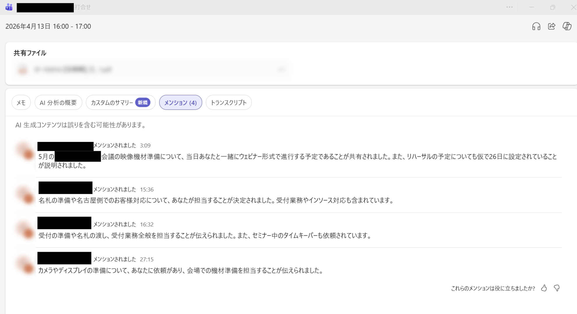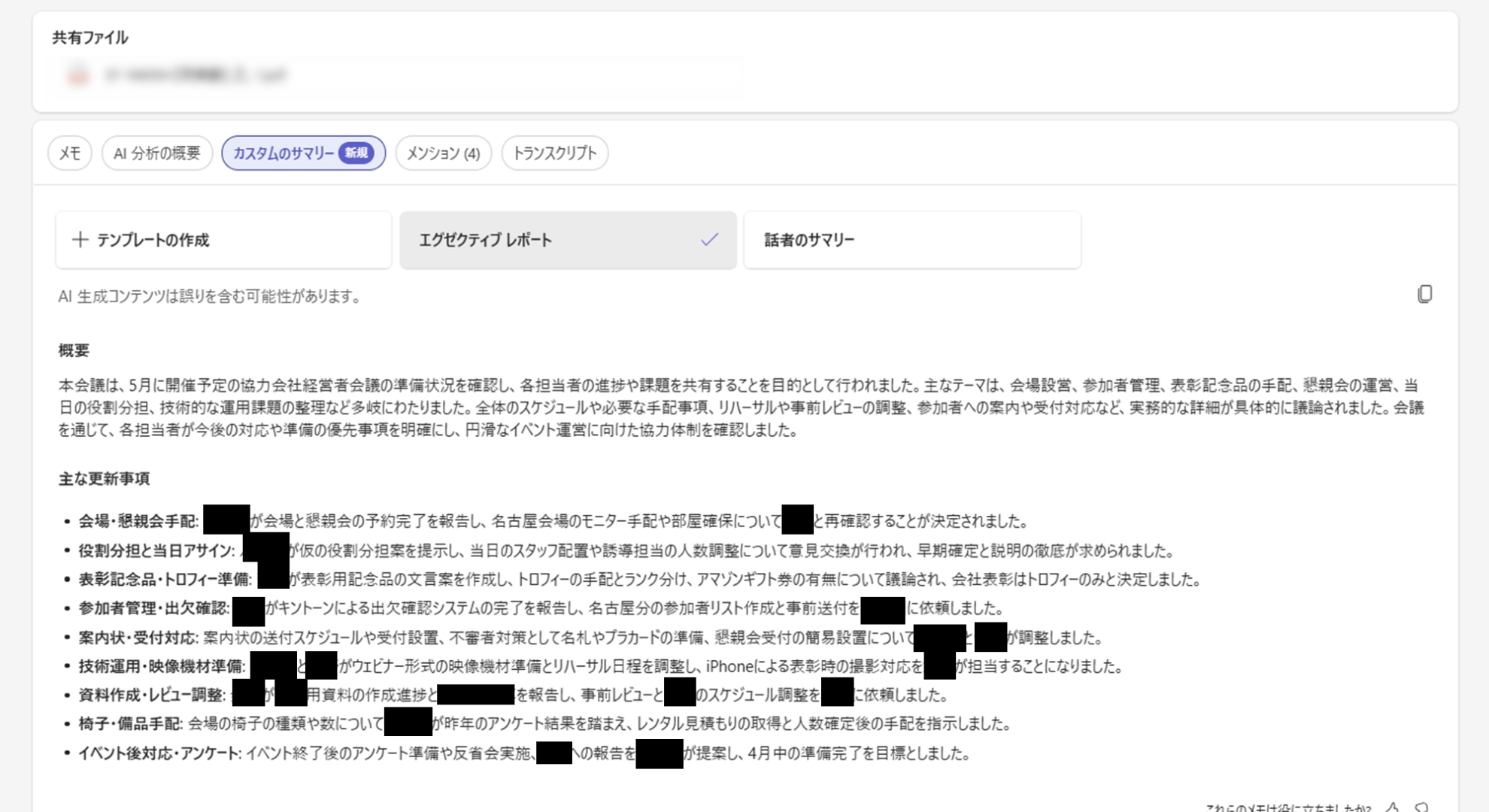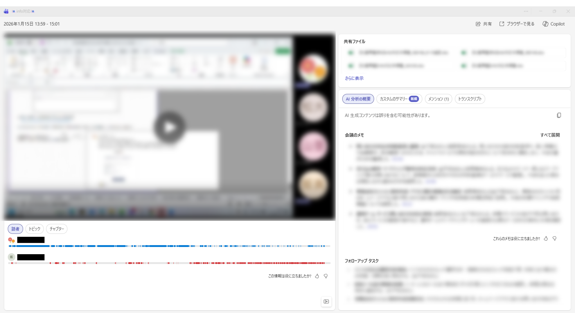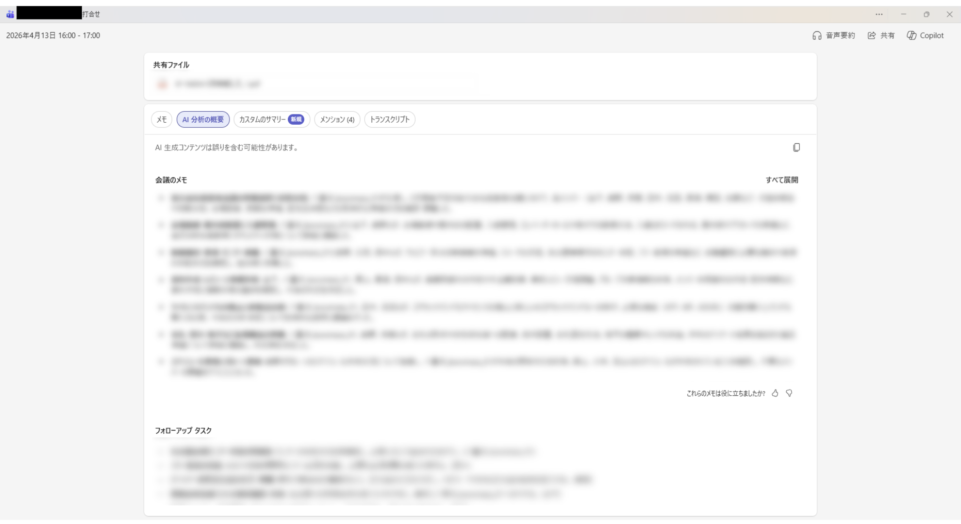 また、自分のPCからTeams会議に参加し、そのPC経由で発言した場合は、おおむね正確に会議内容が反映されていました。一方で、共通のPCを使用して複数人が発言した場合には、実際の担当者とは異なる人物として認識されるケースも見られました。「AI生成コンテンツは誤りを含む可能性があります。」と記載はTeams上でもされてはいるものの、オンサイトでTeams会議を実施する際には特に記載内容に誤りがないか注意が必要かと思いました。