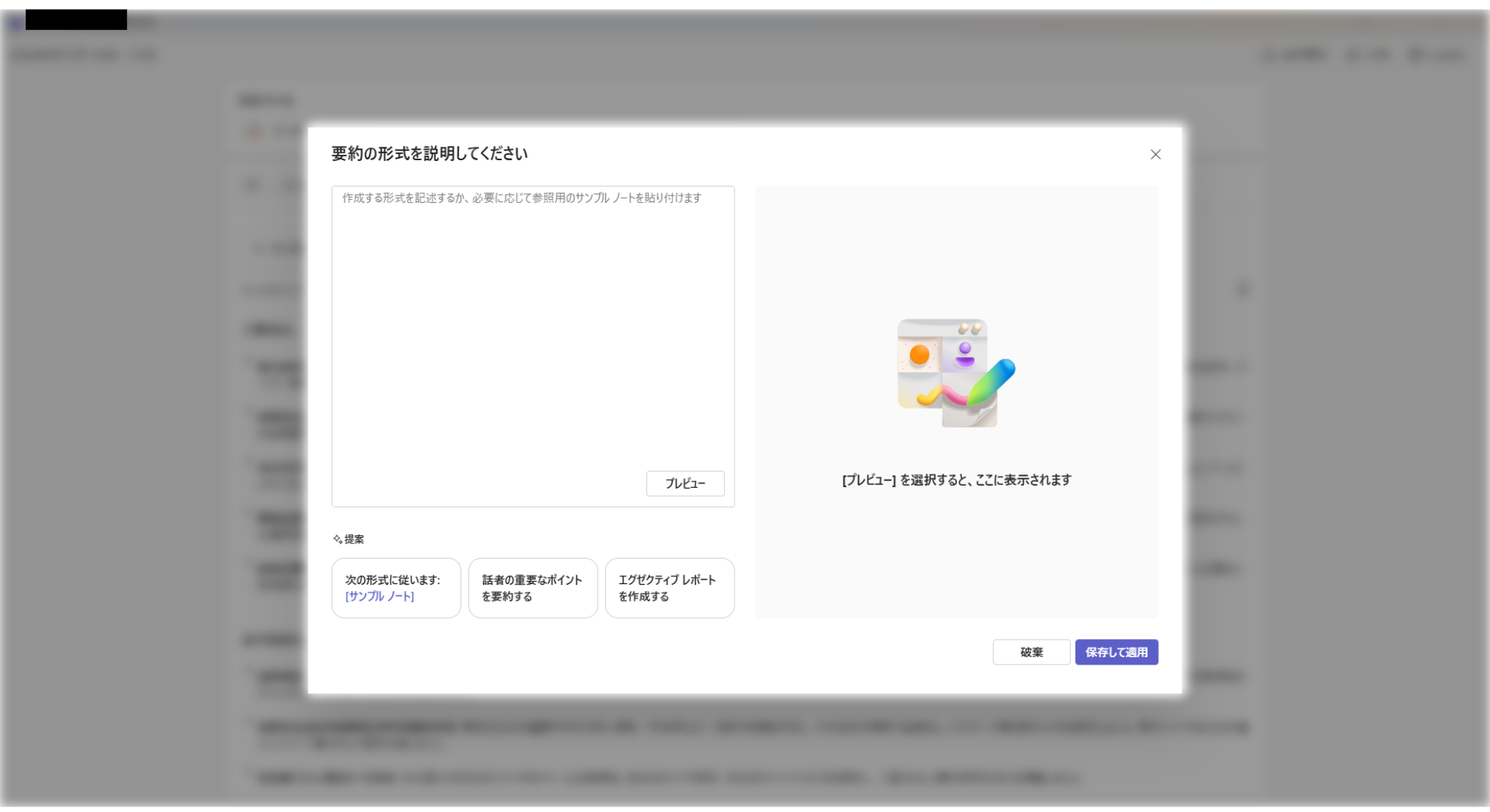 作成する形式を記述する、または必要に応じて参照用のサンプルノートを貼り付けると、その形式に要約をしてくれる機能です。 |